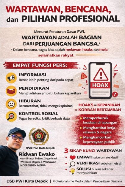 Nasional | • 6 Januari 2026 • Yuk Belajar dari Jepang! PWI Depok Ingatkan Wartawan Stop Eksploitasi Kesedihan Korban Bencana RUZKA INDONESIA — Persatuan Wartawan Indonesia (PWI) Kota Depok menggelar diskusi nasional yang menyoroti peran...