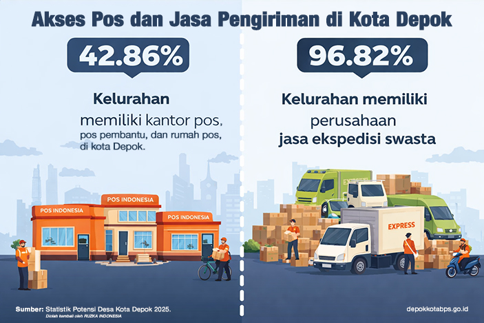 RUZKA INDONESIA โ Angka sering kali terlihat netral. Tapi di balik angka, selalu ada cerita tentang arah pembangunan dan pilihan kebijakan. Data terbaru dari BPS Kota Depok 2025 mencatat sesuatu yang menarik: hanya 42,86 persen kelurahan di Kota Depok yang memiliki kantor pos, pos pembantu, atau rumah pos. Sebaliknya, 96,82 persen kelurahan memiliki perusahaan jasa ekspedisi swasta.