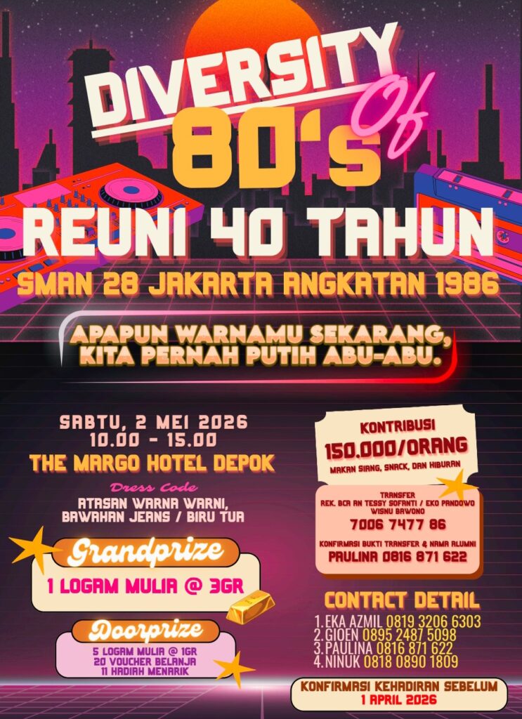 RUZKA INDONESIA — “Diversity Of 80’s” serta kalimat Apapun warnamu sekarang, kita pernah putih abu-abu” merupakan tema dan tagline dari acara Reuni Akbar Alumni SMA Negeri 28 Jakarta Angkatan 1986 dalam rangka memperingati 40 Tahun kelulusan mereka.