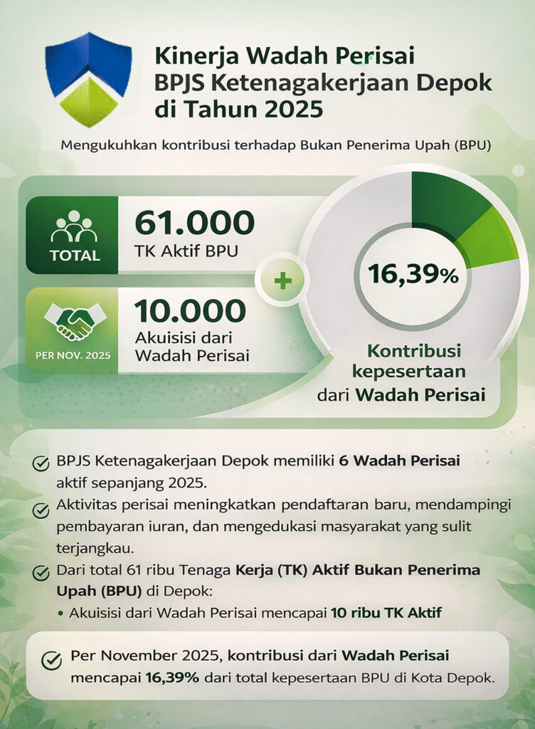Di tingkat akar rumput, peran Wadah Perisai menjadi penting. Hingga 2025, BPJS Ketenagakerjaan Depok memiliki enam Wadah Perisai yang aktif. Sepanjang tahun, kinerja mereka terlihat dari peningkatan pendaftaran baru, pendampingan pembayaran iuran, serta edukasi lapangan yang lebih intensif.