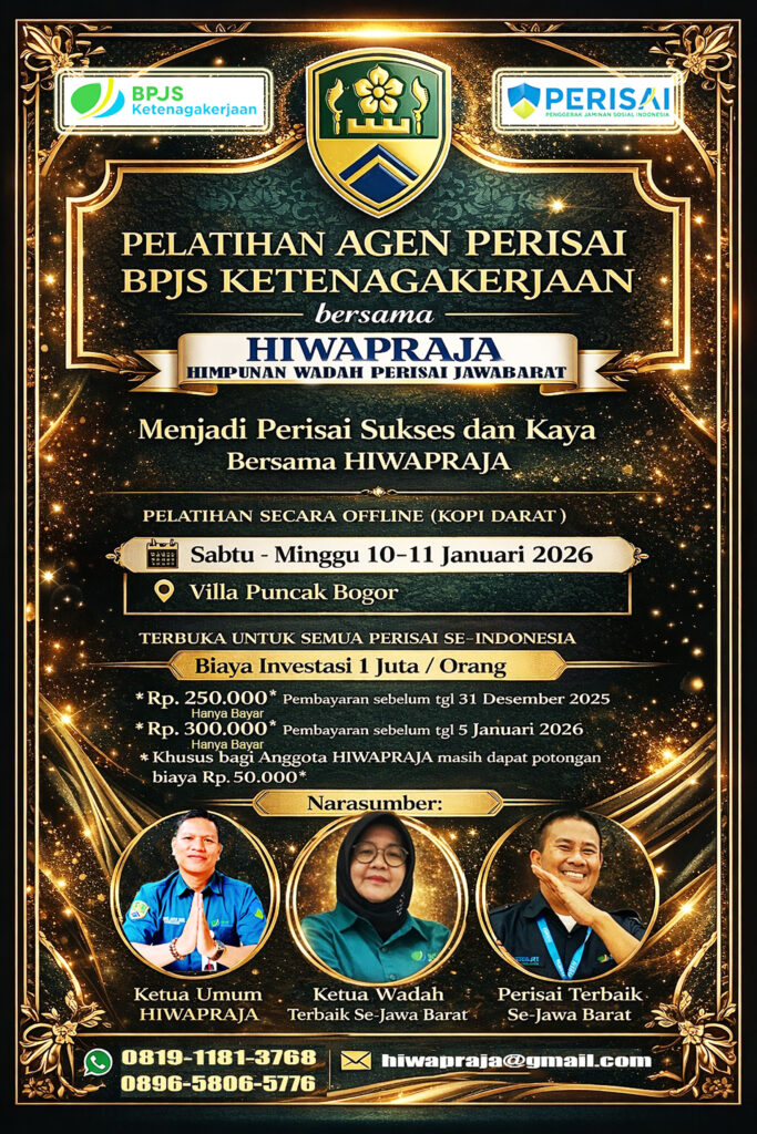 Informasi Pelatihan Agen Perisai BPJS Ketenagakerjaan yang diselenggarakan HIWAPRAJA di Puncak, Bogor, pada 10–11 Januari 2026. (Foto: Dokumentasi HIWAPRAJA)