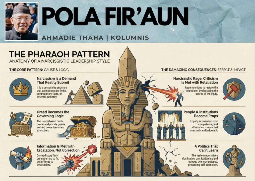 Pada sisi kiri diagram, pola kepemimpinan Firโ€˜aun dimulai dari tiga “akar psikologis dan logika kekuasaan”. Yang pertama adalah “narsisme yang menuntut realitas tunduk”. Dalam pola ini, seorang pemimpin tidak sekadar memiliki ego besar, tetapi menuntut agar dunia menyesuaikan diri dengan citra dirinya. Fakta yang bertentangan dianggap serangan pribadi. Kritik dianggap pemberontakan.