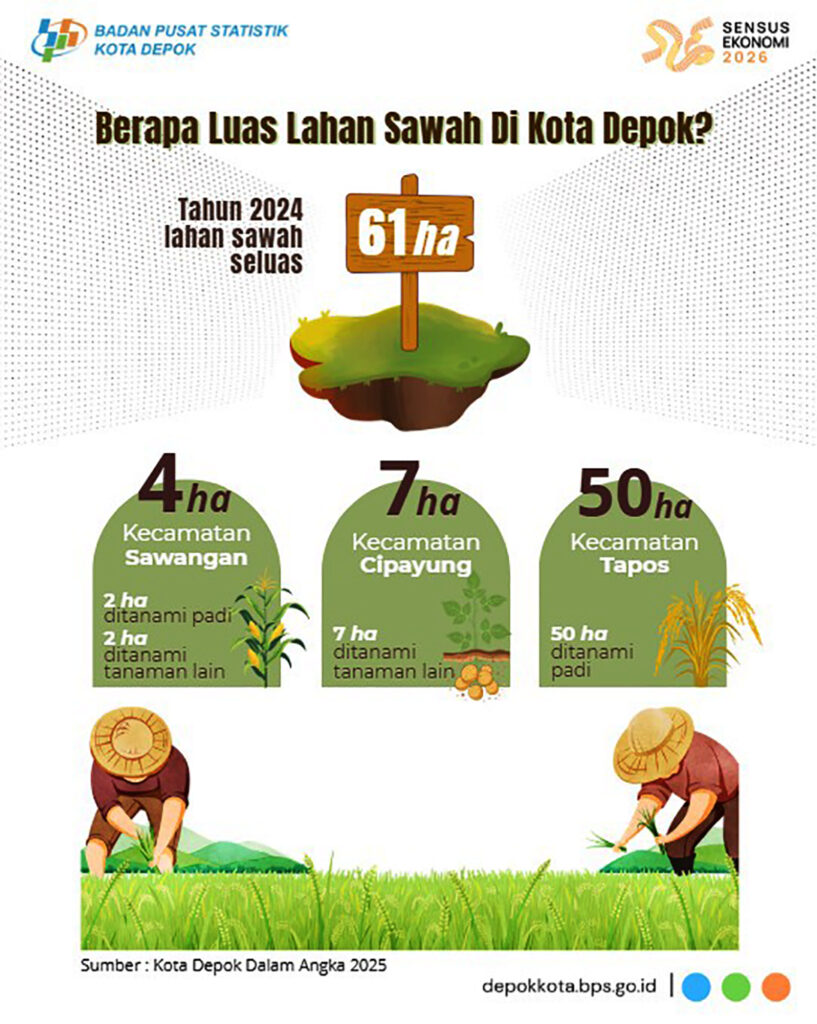 Infografik Badan Pusat Statistik (BPS) Kota Depok menunjukkan luas lahan sawah di Kota Depok pada 2024 tinggal 61 hektare, dengan Kecamatan Tapos menjadi wilayah dengan luasan terbesar. Angka ini menegaskan rapuhnya ruang produksi pangan di kawasan perkotaan. (Sumber: Kota Depok Dalam Angka 2025 / BPS Kota Depok)
