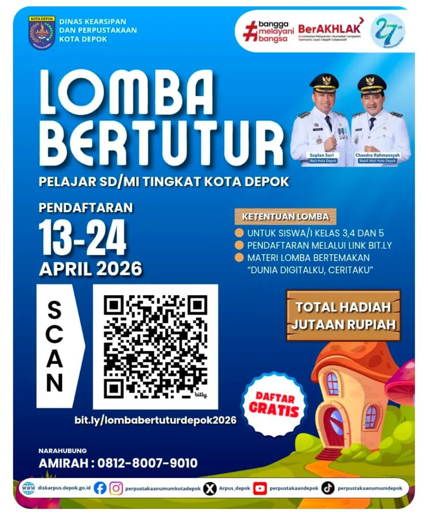 RUZKA INDONESIA — Dinas Kearsipan dan Perpustakaan (Diskarpus) Kota Depok menggelar Lomba Bertutur tingkat SD/MI tahun 2026. Mengusung tema Dunia Digitalku, Ceritaku.