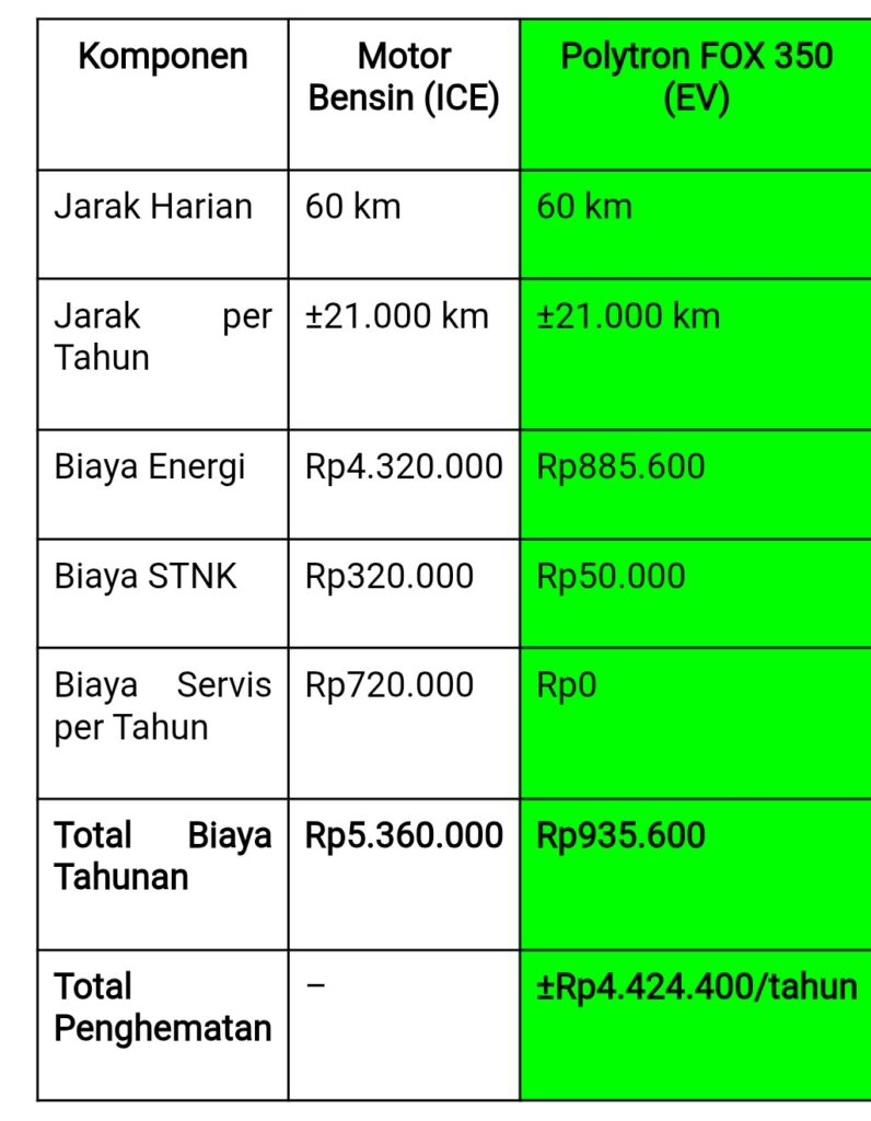 Keunggulan motor listrik terbaik Polytron FOX 350 tidak hanya terletak pada biaya yang lebih rendah, tetapi juga pada transparansi perhitungan yang dapat diprediksi.