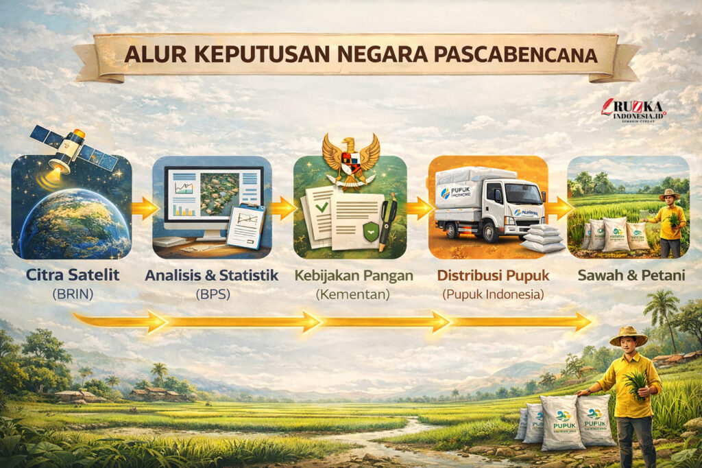 Alur keputusan negara pascabencana: dari citra satelit, analisis statistik, kebijakan pangan, hingga distribusi pupuk ke petani. (Infografis: Diolah Redaksi Ruzka Indonesia)