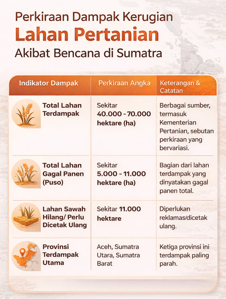 Perkiraan dampak bencana terhadap lahan pertanian di Sumatra, termasuk lahan terdampak dan gagal panen (puso), yang menentukan urgensi pemulihan dan distribusi pupuk. (Sumber: Kementerian Pertanian, berbagai rilis)