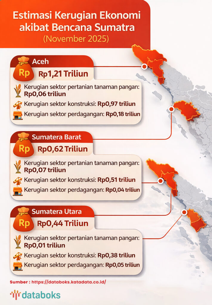 Kerugian terbesar terjadi di Aceh dengan total sekitar Rp1,21 triliun, terutama dari sektor konstruksi dan pertanian tanaman pangan. Sumatera Barat mencatat kerugian sekitar Rp0,62 triliun, sementara Sumatera Utara sekitar Rp0,44 triliun. Di ketiga provinsi tersebut, sektor pertanian tanaman pangan menjadi salah satu sektor yang langsung terpukul, seiring rusaknya lahan, terhentinya produksi, dan tertundanya musim tanam.