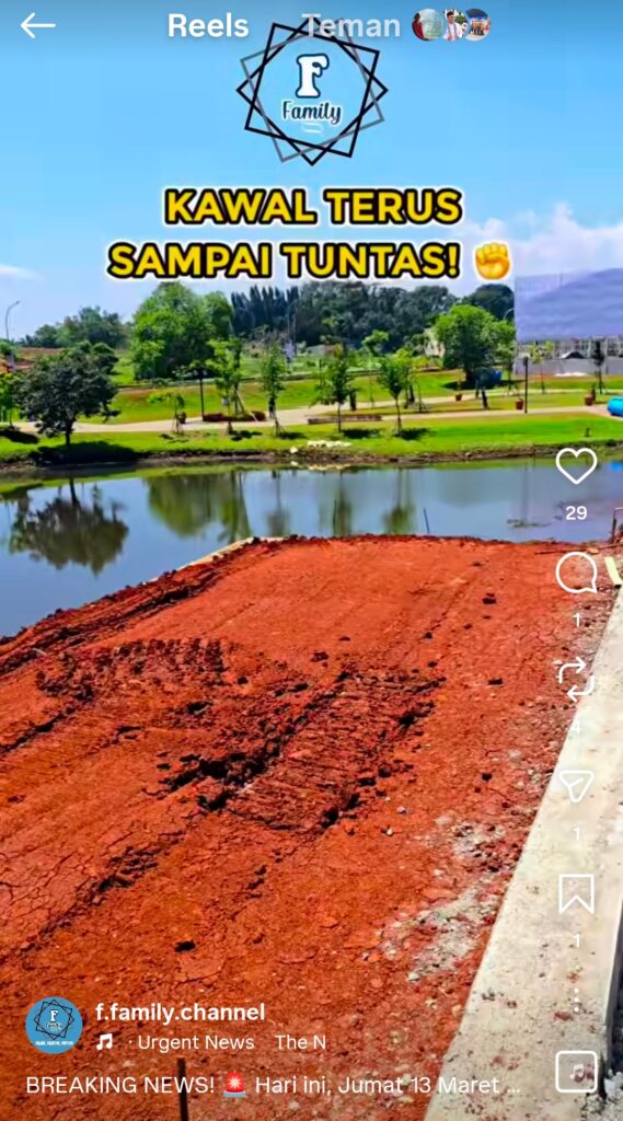 Adanya giat pengurukan garis sepadan Situ 7 Muara terungkap dalam tayangan instagram (IG) f.family.channel pada Kamis 12 Maret 2026.
