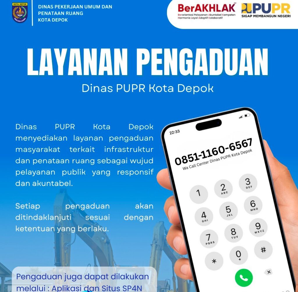 RUZKA INDONESIA — Dinas Pekerjaan Umum dan Penataan Ruang (PUPR) Kota Depok membuka layanan pengaduan masyarakat untuk menjawab berbagai persoalan infrastruktur dan penataan ruang, seperti jalan rusak, saluran drainase, hingga utilitas.