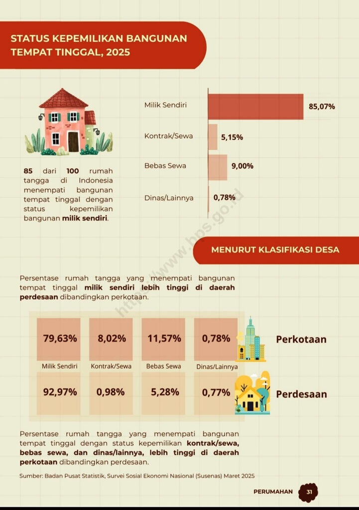 Data Badan Pusat Statistik (BPS) berdasarkan Survei Sosial Ekonomi Nasional (Susenas) Maret 2025 menunjukkan kepemilikan rumah di wilayah perkotaan lebih rendah dibanding perdesaan, menandai paradoks hunian di kota-kota besar. (Sumber: Badan Pusat Statistik)