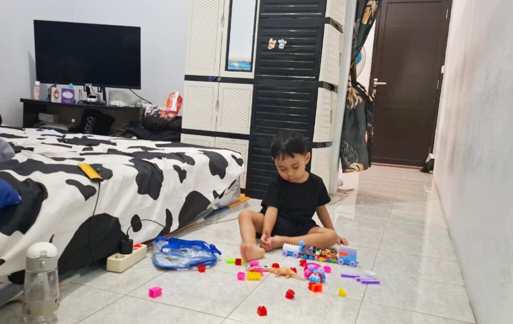 Zubair (2,5 tahun), anak Aini, bermain di lantai rumah kontrakan yang mereka tempati. Ruang sempit itu menjadi tempat tumbuh sekaligus saksi harapan akan rumah sendiri. (Foto: Dokumentasi pribadi Aini)