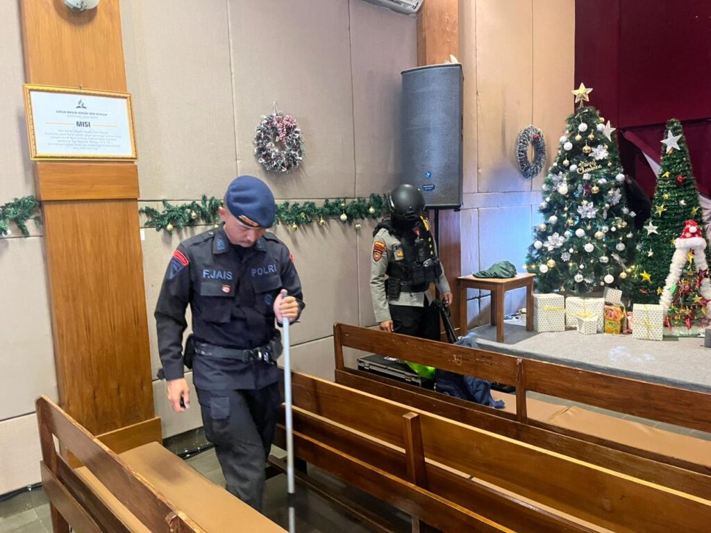 Pelaksanaannya, personel Polres Garut melakukan pemeriksaan secara menyeluruh, baik di dalam maupun di sekitar area gereja, meliputi ruang ibadah, altar, halaman, pintu masuk, hingga area parkir.
