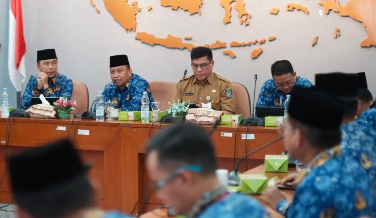 Wali Kota Depok, Supian Suri (dua dari kiri) memberikan arahan pada rakor pimpinan di Balai Kota, Senin (22/12/25). (Foto: Dok Diskominfo Kota Depok)