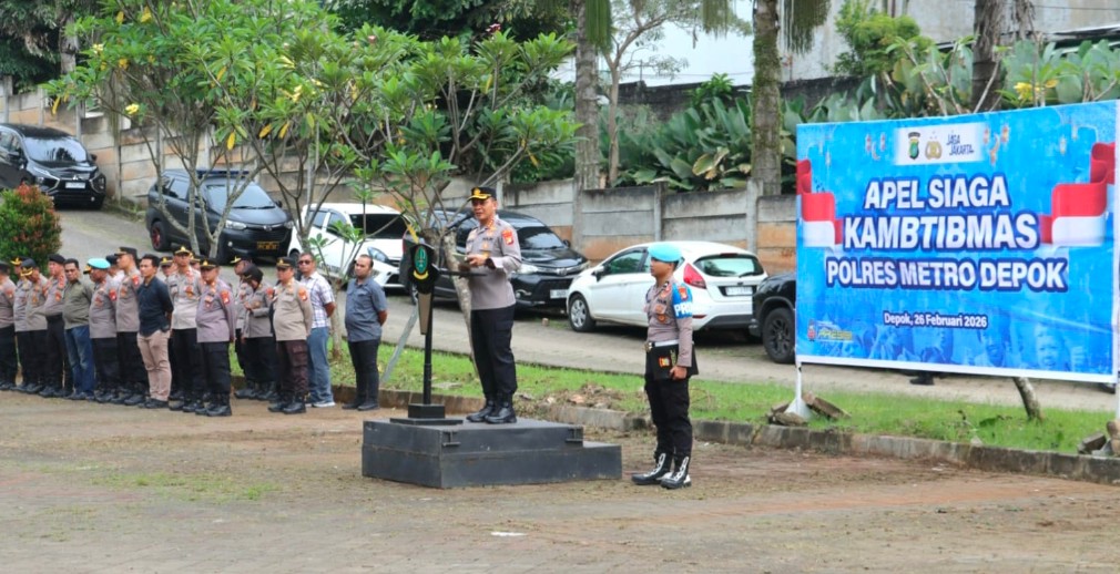 RUZKA INDONESIA — Kapolres Metro Depok Kombes Pol Abdul Waras memimpin Apel Siaga Kamtibmas yang dihadiri potensi masyarakat dan organisasi kemasyarakatan (ormas) se-Kota Depok, Kamis (26/02/2026).